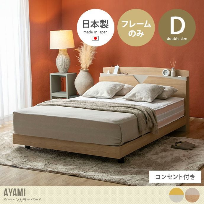 女性の曲線美から生まれた『AYAMI(アヤミ)』のベッドフレーム。ヘッドボードは柔らかなラインの流れをイメージし、美しく優雅な雰囲気溢れるデザインに。ツートンカラーの棚はベッドフレームを、よりおしゃれに映えさせてくれます。1口コンセントが両端に1つずつ、合計で2つ付いており、寝ながらスマートフォンやタブレットなどの充電が可能です。ベッドフレームには地球温暖化の原因のアブラヤシ廃材を再生した「PPALM LOOP」を使用。CO2削減に貢献できる、環境に優しいベッドフレームとなっております。
