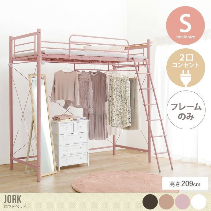 ベッド下の空間にカーテンが取り付けることができる『Jork(ヨルク)』シリーズのパイプロフトベッド。2口コンセント付きの棚がついているので枕元で携帯の充電や間接照明を使うことも可能。ハンガーポールがついているのでベッド下を収納スペースとしても有効活用できるので一人暮らしのワンルームの方にもおすすめです。また組み替えるだけで普通のベッドとしても使えるのでライフスタイルやお部屋が変わっても使っていただけます。