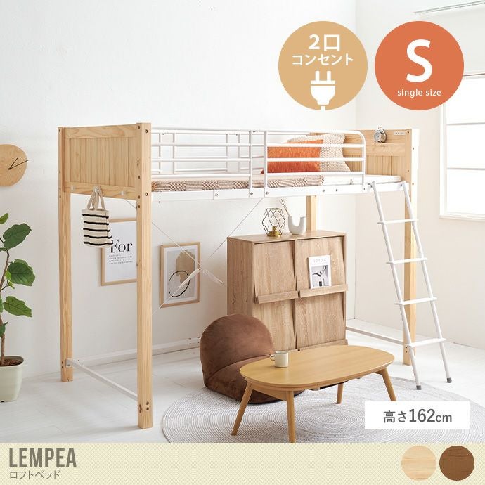 安心安全にこだわった『LEMPEA(レンペア)』ロフトベッド。4方向のフレームに加え、ハイタイプのサイドガード付きで就寝中の寝返りで体を動かしても安心。寝具のズレも防ぐため、薄いマットレスや敷布団はもちろん、厚みのあるマットレスもお使いいただけます。またお部屋に圧迫感を与えない程よい高さで、ベッド下のスペースを有効活用。狭いお部屋にお住いの方にもおすすめです。さらにちょっとした小物が置ける宮棚には2口コンセントを設置。ベッドから降りずにスマホの充電やライトや加湿器などお使いいただけます。
