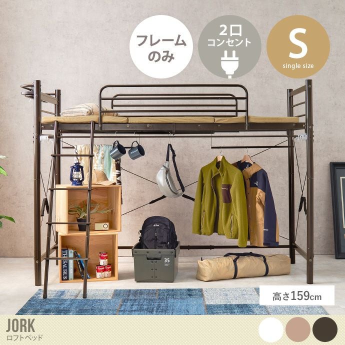 自分だけの収納空間が作れる『Jork(ジョーク)』ロフトベッド。べッド下は衣類やキッズ用品などの収納スペースとして活躍し、市販のカーテンを取り付けることができるため、急な来客時でもサッと隠せて、見た目もスッキリ。またちょっとした小物が置ける宮棚には2口コンセントを設置しており、ベッドから降りずにスマホの充電やライトや加湿器などお使いいただけます。さらに普通のベッドとしても使用できる2way仕様に。ライフスタイルに合わせてお使いいただけます。