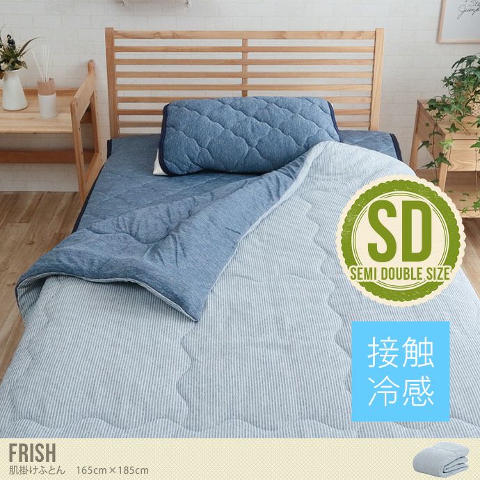 快適ひんやり寝具『Frish』シリーズの肌掛けふとん。片面はひんやり気持ちいい接触冷感素材、もう片面はさらっとした手触りのパイル生地のリバーシブルなので、暑さや気分に合わせてお好きな手触りをお楽しみいただけます。お洗濯も可能なのでお手入れ簡単、衛生的にお使いいただけます。