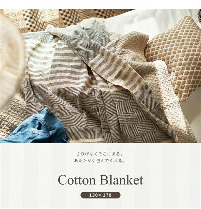 上質なコットンを100%使用した肌触りの良いブランケット。敏感肌やアレルギーのある方でも安心して使える素材で、リビングやベッドなどでの膝掛けに最適。また170cm×130cmの大きめサイズで、すっぽり身体を包み込めるため、お昼寝やちょっとした休憩時間にもぴったりです。さらに落ち着いた色合いとシンプルな模様は、お部屋の雰囲気を邪魔せず、程よいアクセントに。ソファやベッドにさっと掛けるだけで、見た目にも温かみが感じられ、お部屋全体に上質で落ち着いた雰囲気を与えます。