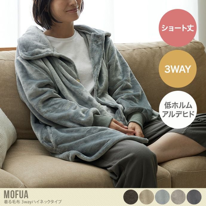 ずっと触れていたくなるプレミアムマイクロファイバー 着る毛布『Mofua(モフア)』から3wayハイネックタイプのショート丈サイズが登場しました。首元を襟タイプ、ハイネックタイプ、密着タイプとシーンに合わせて3段階に形を変えれるように設定。リラックスタイムだけでなく家事タイムでも使える充実した機能性がたくさん備わっています。人気のくすみカラーを合わせた5色からお選びいただけます。