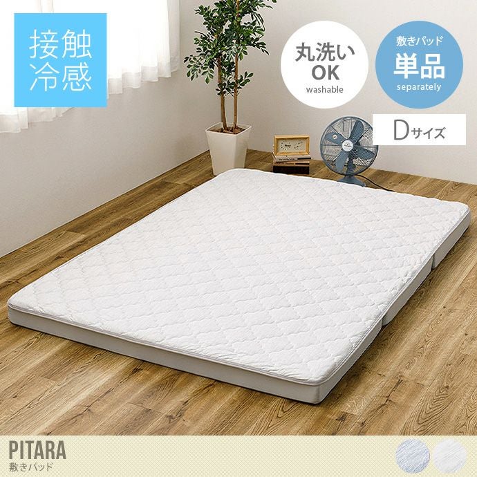 ピタッとズレずに密着してくれる『Pitara(ピターラ)』敷きパッド。ひんやり気持ちのいい接触冷感生地を使用しており、寝苦しい夏の夜も快適にお過ごしいただけます。また別売りのマットレスと組み合わせることにより、吸いつくような密着感でズレにくいため、寝具のズレ問題もラクラク解決。さらにご家庭で洗濯ができるため、いつでも清潔にお使いいただけます。