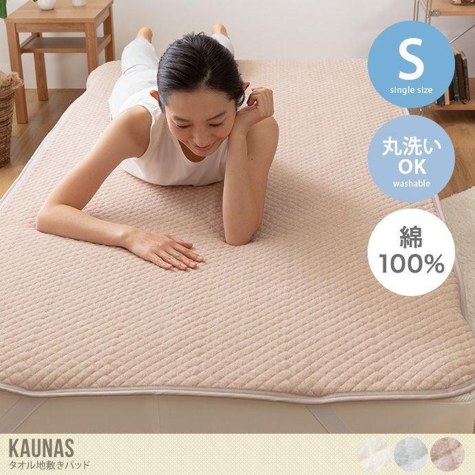 綿100%で吸収性に優れたタオル地敷きパッド『Kaunas(カウナス)』。「さらっと」「ふわっと」した肌ざわりで寝心地の良さにこだわりました。バンドは外しやすく、ずれにくいゴムタイプで、厚みのあるマットレスから敷布団まで幅広く使っていただけます。サイズ展開も豊富なので、ご自宅のマットレスにピッタリなサイズをお選びいただけます。