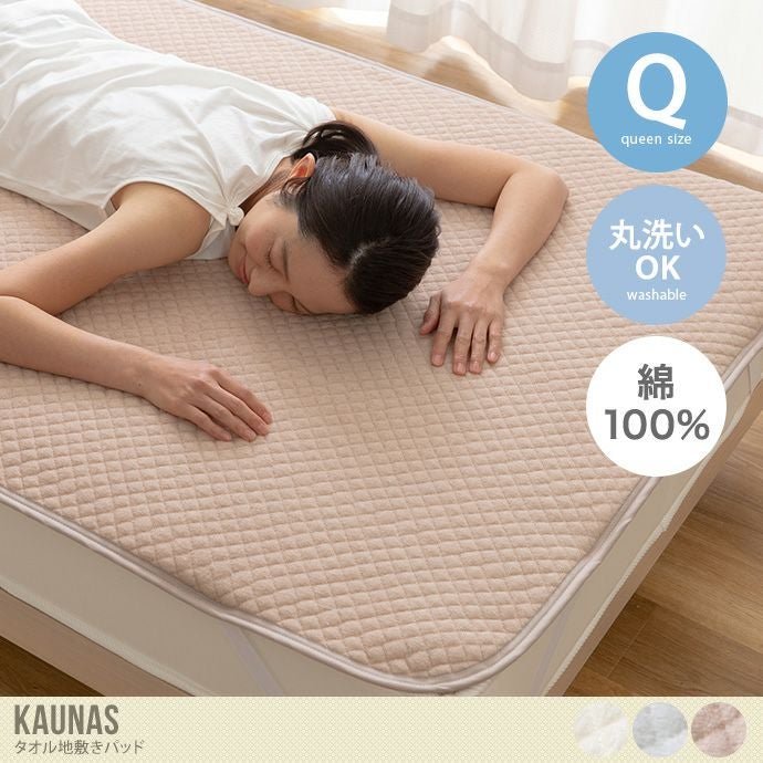 綿100%で吸収性に優れたタオル地敷きパッド『Kaunas(カウナス)』。「さらっと」「ふわっと」した肌ざわりで寝心地の良さにこだわりました。バンドは外しやすく、ずれにくいゴムタイプで、厚みのあるマットレスから敷布団まで幅広く使っていただけます。サイズ展開も豊富なので、ご自宅のマットレスにピッタリなサイズをお選びいただけます。