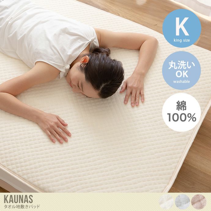 綿100%で吸収性に優れたタオル地敷きパッド『Kaunas(カウナス)』。「さらっと」「ふわっと」した肌ざわりで寝心地の良さにこだわりました。バンドは外しやすく、ずれにくいゴムタイプで、厚みのあるマットレスから敷布団まで幅広く使っていただけます。サイズ展開も豊富なので、ご自宅のマットレスにピッタリなサイズをお選びいただけます。