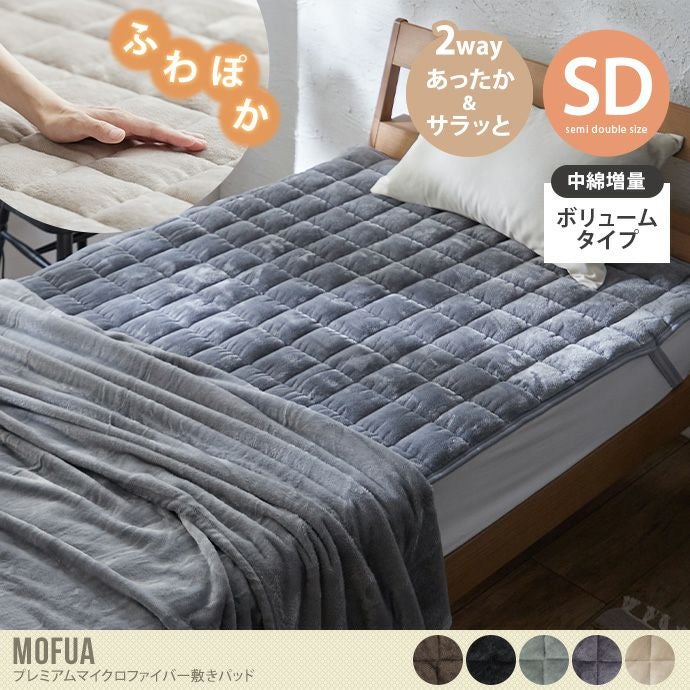 ふわっふわでなめらかな肌触りの寒い季節の人気商品となっている『Mofua(モフア)』シリーズから、プレミアムマイクロファイバー敷きパッド中綿増量ボリュームタイプのセミダブルサイズが登場しました。シルクやアンゴラなどの天然繊維を超える極細繊維が使われているので、繊維の隙間に空気の層ができて体温で暖まった空気をしっかりキープしてくれます。四隅にゴムバンドが付いているのでズレる心配がありません。また中綿面をたっぷりと通常の2.5倍入れ、ほどよいクッション性でふっくら柔らかく温かい寝心地に仕上げました。一般的なマイクロファイバー毛布と比べると極細繊維で密度が高いので毛が抜けにくく、ご自宅の洗濯機で手軽に洗濯できます。