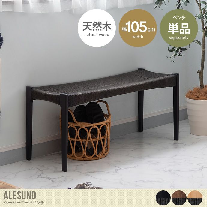 北欧家具を代表するペーパーコードを採用した、シンプルで美しい『Alesund(オーレスン)』のペーパーコードベンチ。フレームには木目が美しい天然木アッシュ材を使用し、使い込むうちに木目が徐々に鮮やかになっていくのも魅力です。座面にはペーパーコードを使用しており、時間をかけて体に馴染んでいくので、自分好みに育てていくことができるベンチになっております。繊細で美しく、天然素材ならではの温もりを感じるデザインは北欧テイストだけでなく、和テイストのお部屋とも相性抜群です。