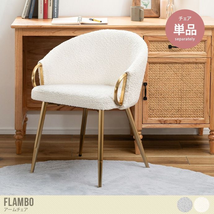 甘すぎないオトナカワイイ雰囲気の『Flambo(フランボ)』アームチェア。艶のあるゴールド脚と、背面まで覆ったブークレ生地の組み合わせが上品なデザイン。どの角度から見ても美しく、お部屋の雰囲気を損ないません。また背もたれと肘掛けが一体化したフォルムで、身体を包み込むようなフィット感に。緩やかなカーブに身を任せてゆったりとくつろいでいただけます。
