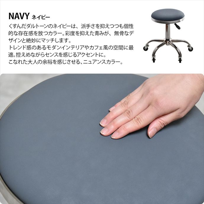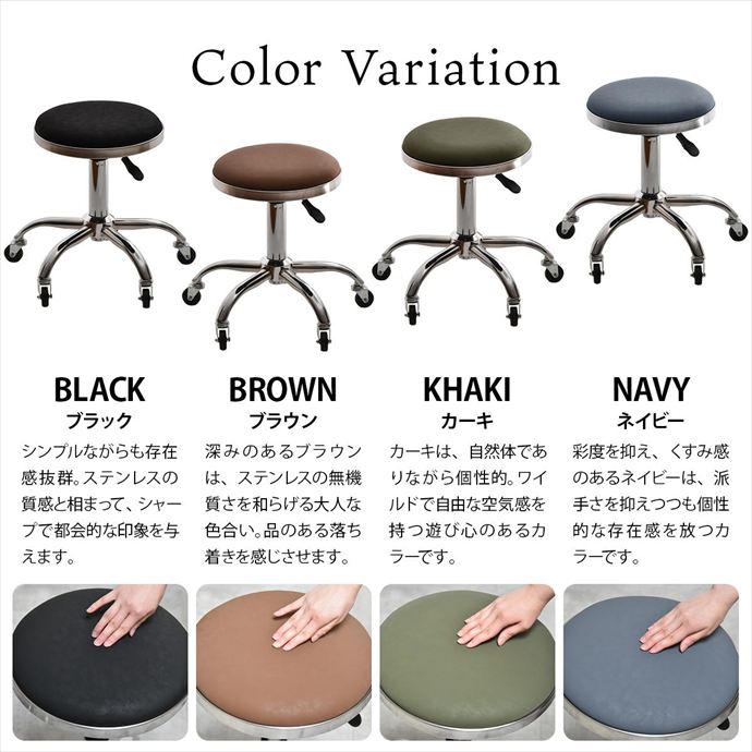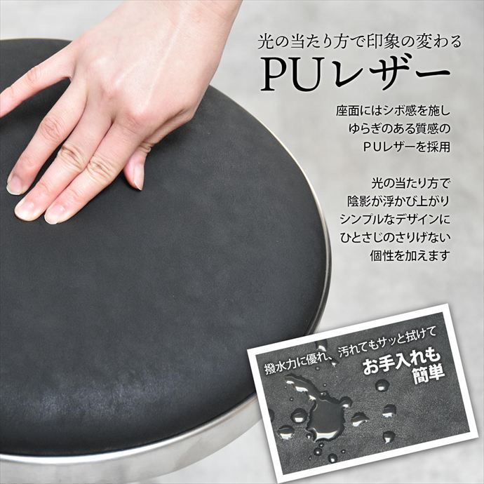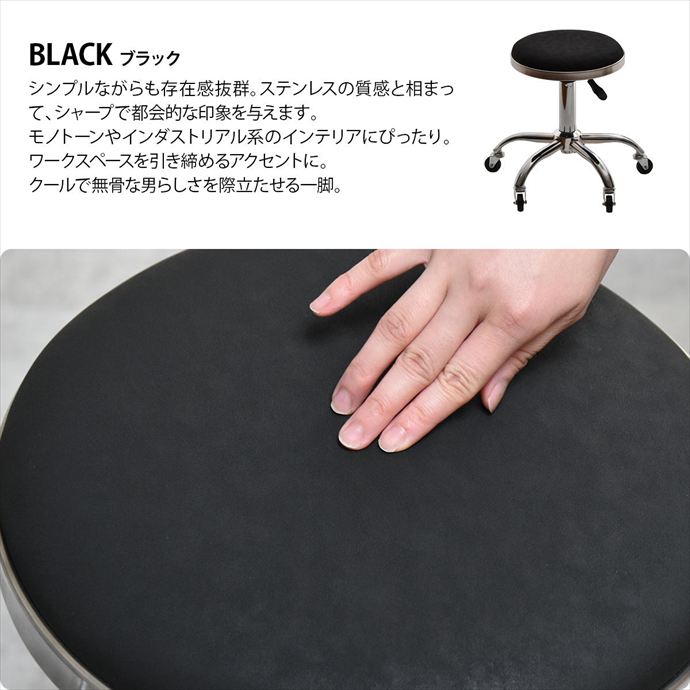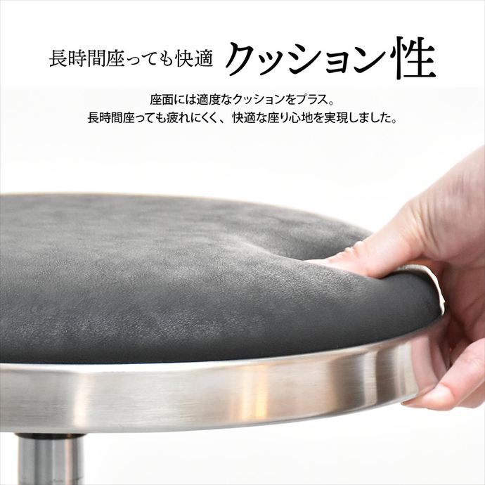 スタイリッシュなデザインの昇降式スツール。ステンレスのフレームと座面のPUレザーの組み合わせが、シックで洗練された印象に。また360度回転式で高さ調節も可能のため、キッチンやデスク、サロンワークなど様々なシーンで快適にお使いいただけます。デザイン性だけでなく実用性も兼ね備えた、一脚あると便利なスツールです。