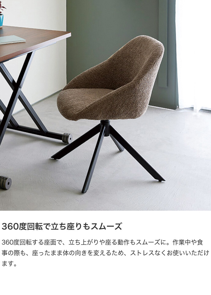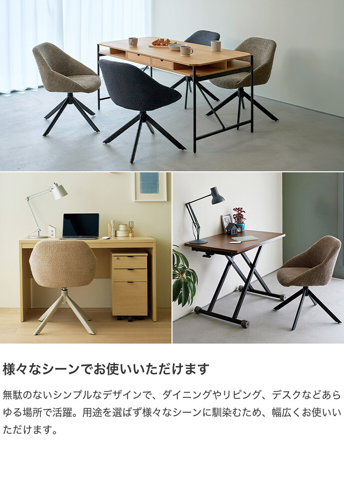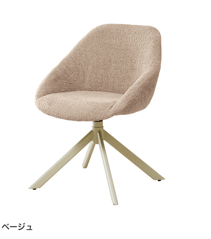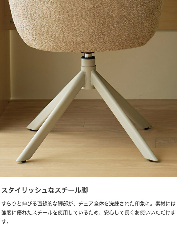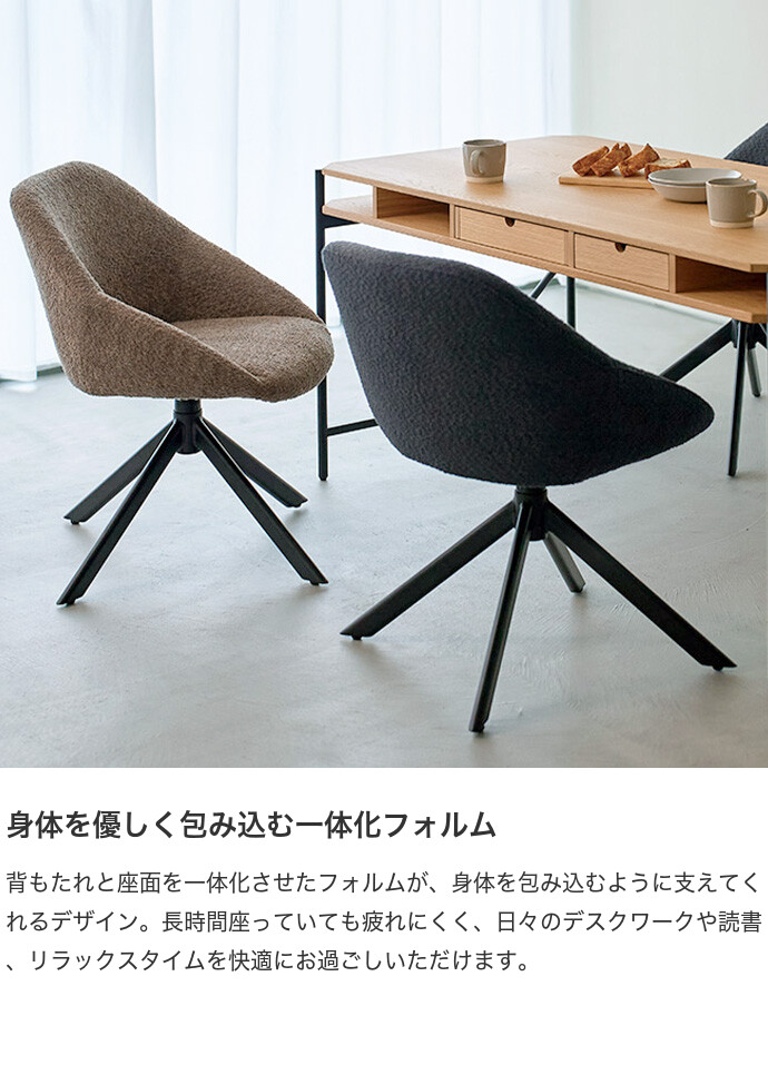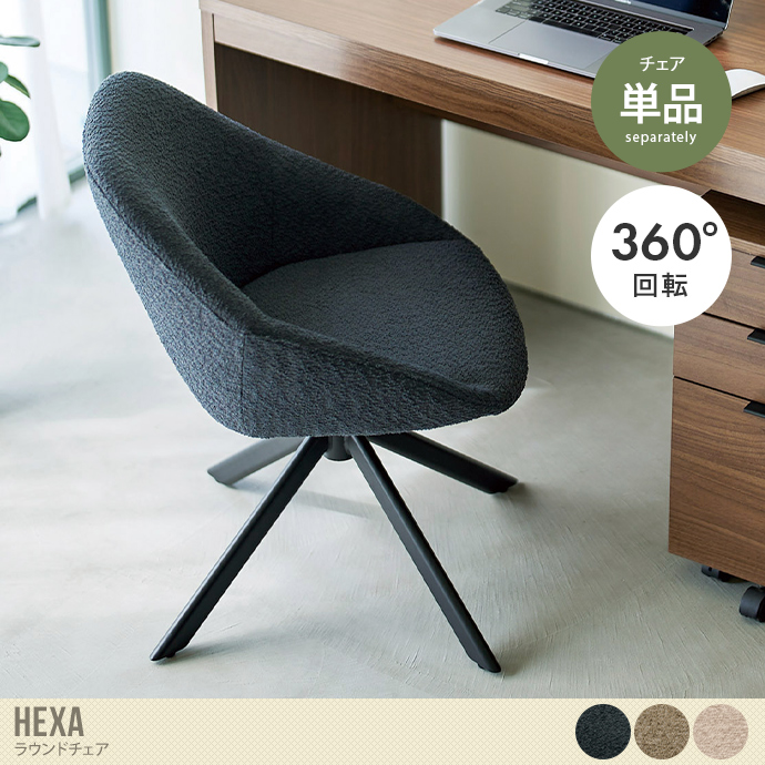 ふんわりとしたブークレ調の張地と、直線的でシャープなスチール脚を組み合わせた『Hexa(ヘクサ)』ラウンドチェア。温かみのある柔らかな見た目がお部屋にやさしく溶け込み、置くだけでワンランク上の空間を演出します。また背もたれと座面を一体化させたフォルムは、身体を包み込むように支えてくれるため、長時間の使用も快適です。さらに座面は360度回転式で、立ち座りや向きを変える動作もスムーズに。デザイン性と機能性を兼ね備えた、暮らしに寄り添う一脚です。