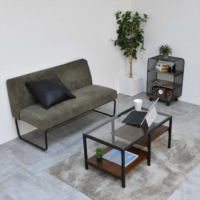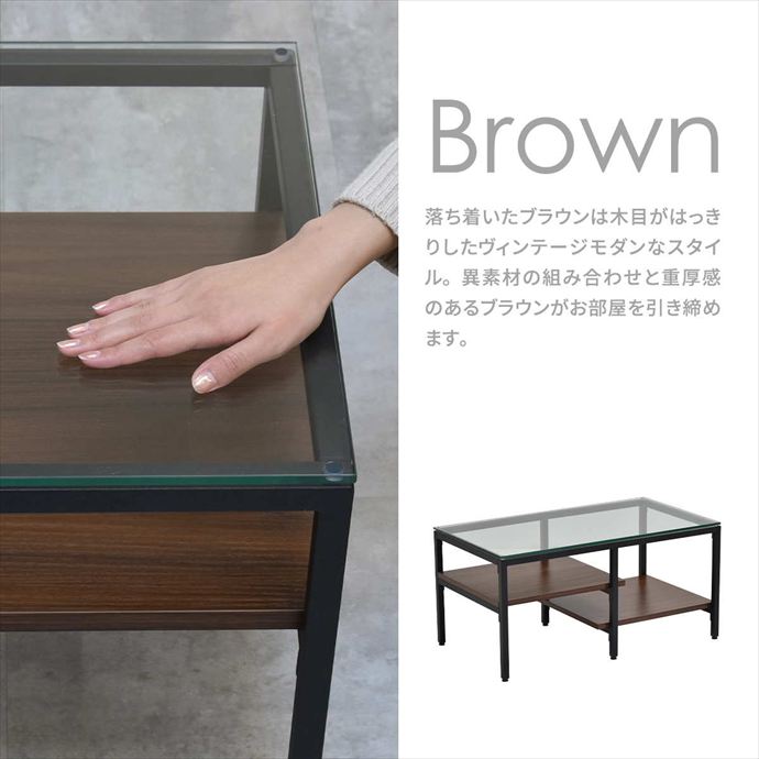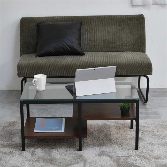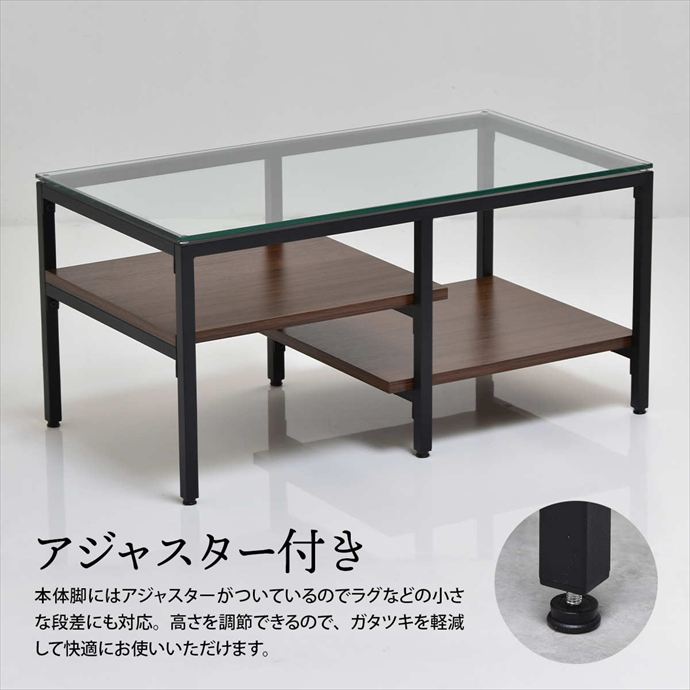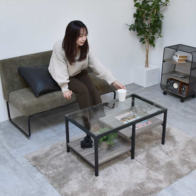 透明なガラス天板とアシンメトリーなデザインが目を引くセンターテーブル。天板には透明な強化ガラスを使用し、圧迫感を抑えつつ美しい抜け感のある空間を演出。棚板は日常で使う雑誌やリモコンを収納するだけでなく、高さの変化を活かしてお気に入りの小物や雑貨をディスプレイすることも可能です。洗練されたデザインと実用性を両立したテーブルは、空間に程よいアクセントを与えながら暮らしに寄り添います。