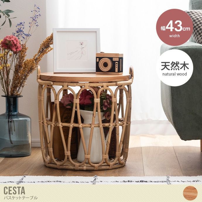 取り外し可能な天板が付いた収納ができる『Cesta(セースタ)』のバスケットテーブル。天然素材を使った編み込みが美しいバスケット部分には、ブランケットや雑貨などたっぷりと収納できます。ベッドやソファ横に置いてサイドテーブルとしてだけでなく、ディフューザーやお気に入りのアイテムを飾ったりとディスプレイとしてもお使いいただけます。