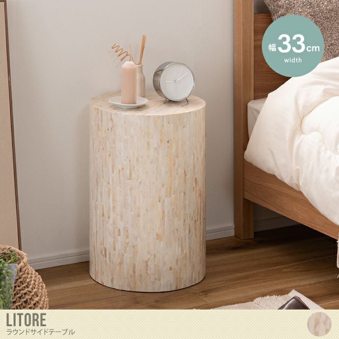 【送料無料】幅33 サイドテーブル テーブル ナイトテーブル ミニテーブル 机 ディスプレイ おしゃれ おすすめ 安い 円形 丸 円柱 ラウンド 真珠母貝 パール 貝 シェル 天然素材 かわいい 韓国 ベッド ソファ 軽量 組立不要 完成品 ベージュ
