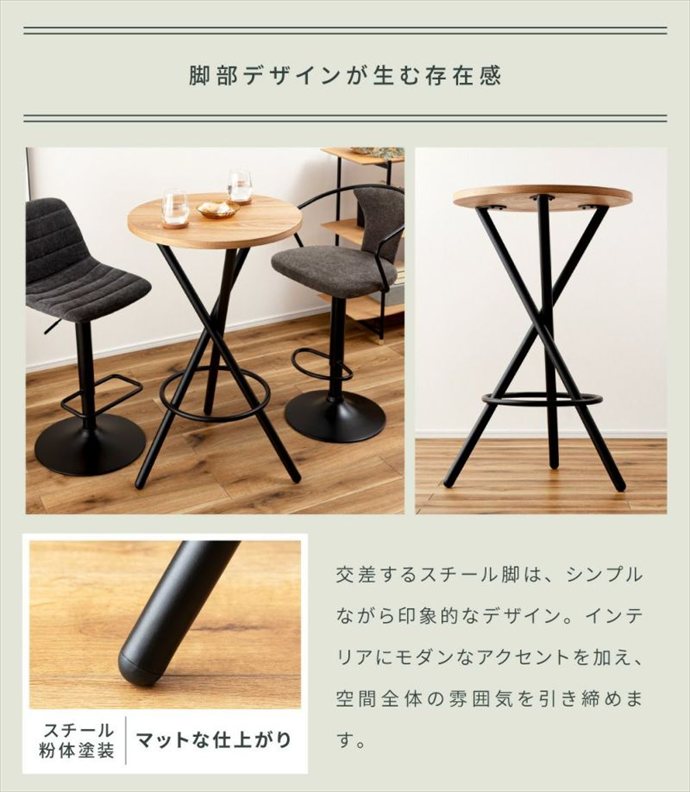 ラウンド型フォルムと、美しい木目が映えるラウンドハイテーブル。天然木の温もりとシャープなブラックスチールが生み出すコントラストが、北欧ナチュラルからモダンテイストまで、幅広いインテリアに上質なアクセントを添えます。また円形の天板は、自然と視線が中心に集まり、会話が弾む心地よい距離感を実現。さらに安定感あるクロス構造の脚部で、美しさと機能性を両立しました。自宅でカフェのようなくつろぎの時間を演出します。