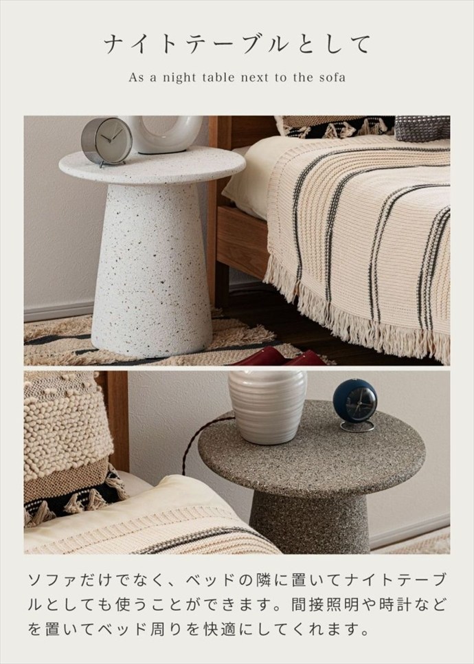 テラゾー柄が引き立てる、上品なラウンドテーブル。本物の石のようにざらりとしたシックなテラゾー柄が、空間にやさしい奥行きを加えます。丸みのある天板と、安定感のある裾広がりのベースがバランスよく調和し、上質で心地よい佇まいに。単体での使用はもちろん、サイズ違いを組み合わせればネストテーブルとしてもお使いいただけます。