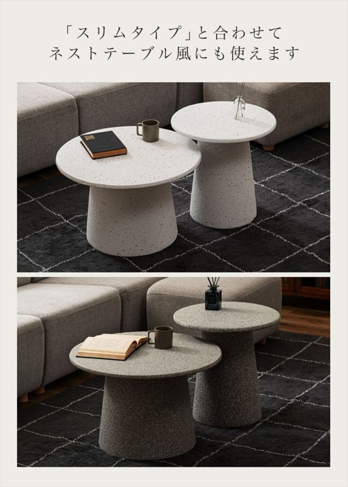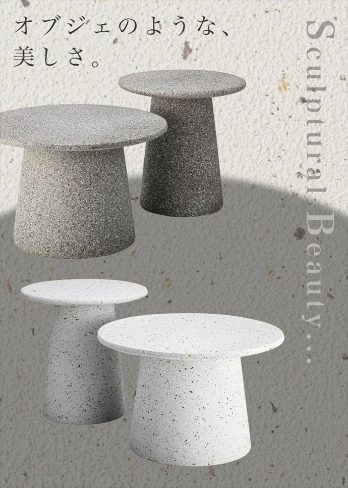 テラゾー柄が引き立てる、上品なラウンドテーブル。本物の石のようにざらりとしたシックなテラゾー柄が、空間にやさしい奥行きを加えます。丸みのある天板と、安定感のある裾広がりのベースがバランスよく調和し、上質で心地よい佇まいに。単体での使用はもちろん、サイズ違いを組み合わせればネストテーブルとしてもお使いいただけます。