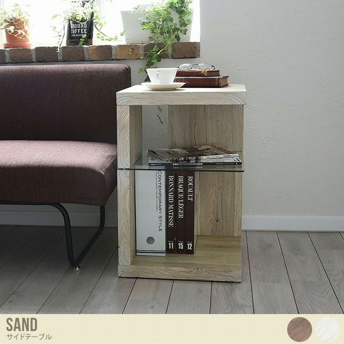 厚みのある板が特徴の『SAND(サンド)』シリーズからサイドテーブルの登場です。40mmの重圧感のある板に透明な強化ガラス棚は使いやすい手頃なものになっています。