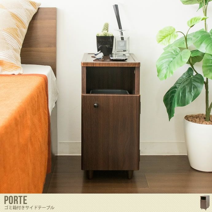 幅20cmとコンパクトサイズでお部屋のちょっとしたデッドスペースに置くことができる『Porte』ゴミ箱付きサイドテーブル。天板はマグカップやちょっとした小物などが置けるスペースとなっています。また、袋止めが付いたゴミ箱も付いているので、ゴミ袋やレジ袋がセットでき、扉の上部からゴミをサッと捨てられます。ソファの横やベッドの横など、場所を選ばすお使いいただけますよ♪