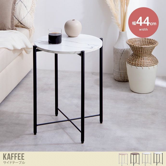 空間に柔らかな印象を与える丸型天板の『Kaffee(カーフィ)』サイドテーブル。大理石柄と木目柄の2種類でご用意しており、脚はスタイリッシュなスチール脚を使用しています。ソファサイドやベッドサイドなどに省スペースで置けるので、一人暮らしやワンルームにお住まいの方にもおすすめです。また、天板はトレー型で取り外しが可能。物を乗せてお部屋まで持ち運ぶ時も楽々です。さらに、天板にはメラミン加工が施されているので、万が一飲み物などをこぼしても、サッと拭いてお手入れができ安心です。