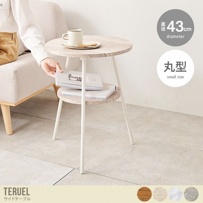 便利な棚板もついた丸型サイドテーブル『Teruel(テルエル)』。お部屋の雰囲気に合わせた4色展開で、柔らかい木目のデザインと、洗礼された高級感のあるストーンのデザインからお選びいただけます。直径43cmのちょうどいいサイズ設計。ベッドサイド、ソファサイドだけでなく、エントランスの物置としても使える万能アイテムです。