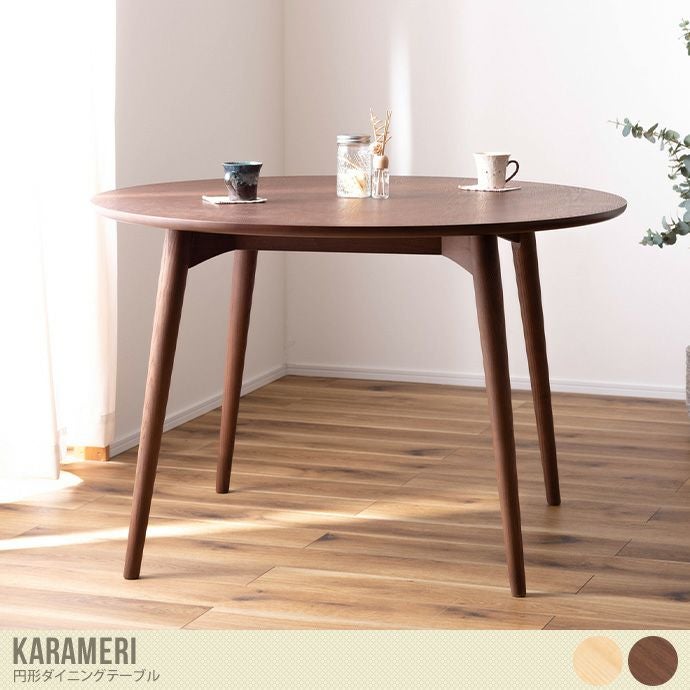 天然木アッシュを使用した落ち着いたオシャレな円形ダイニングテーブル『Karameri(カラメリ)』。シンプルなのでどんなテイストのお部屋にも馴染み、グラつき防止構造でストレスなくご使用いただけます。