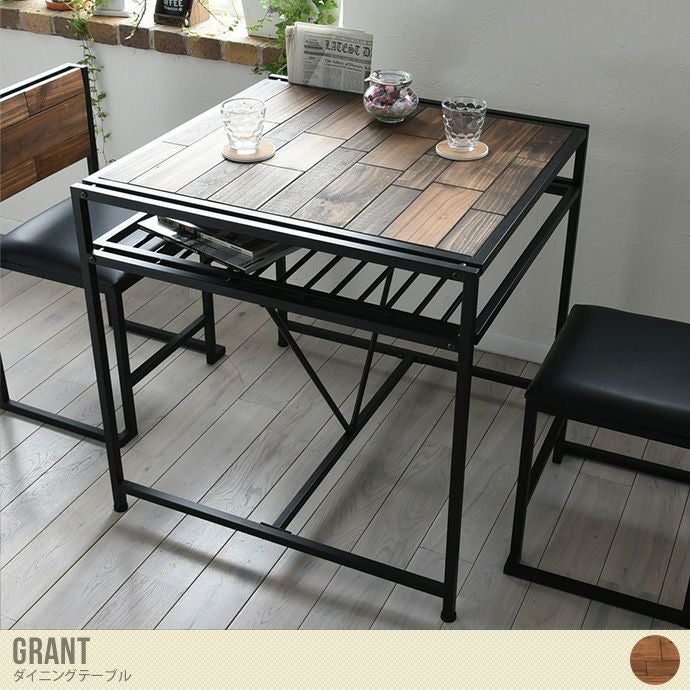 天然木のブロックを組み合わせた個性的な『GRANT(グラント)』のダイニングテーブルです。天板の下にはアイアンの棚板があり雑誌や新聞、テレビのリモコンなどささっと片付けることができます。