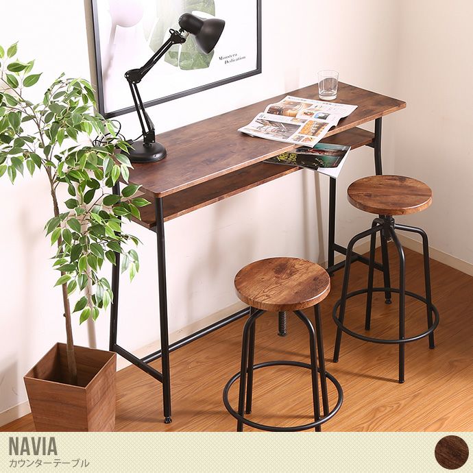 深い木目とブラックのフレームがヴィンテージな印象を与える『Navia(ナビア)』シリーズからカウンターテーブルの登場です。スリムで省スペースな設計になっていますが2人で横並びになるのに丁度いいサイズで、天板下には便利な収納棚も付いています。
