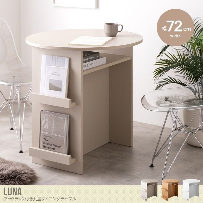 【送料無料】Luna ルナ 幅72 ダイニングテーブル ラウンド 丸形 円形 食卓 机 デスク 収納 棚付き コンパクト 省スペース カフェテーブル 丸型 ブックラック マガジンラック 本 PC 雑誌 来客 食事 作業台 リビング 一人暮らし 1人掛け 2人 グレージュ