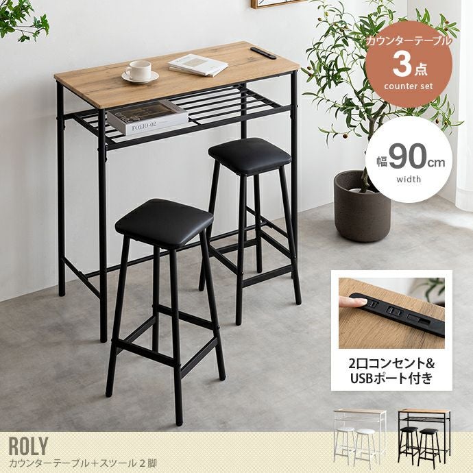 【送料無料】Roly ローリー 幅90 カウンターテーブル ダイニング ハイ PCデスク カフェ 作業机 棚 コンセント USBポート 3点セット スツール バー 一人暮らし 食卓 省スペース コンパクト スリム キッチン 作業 シンプル テレワーク ホワイト