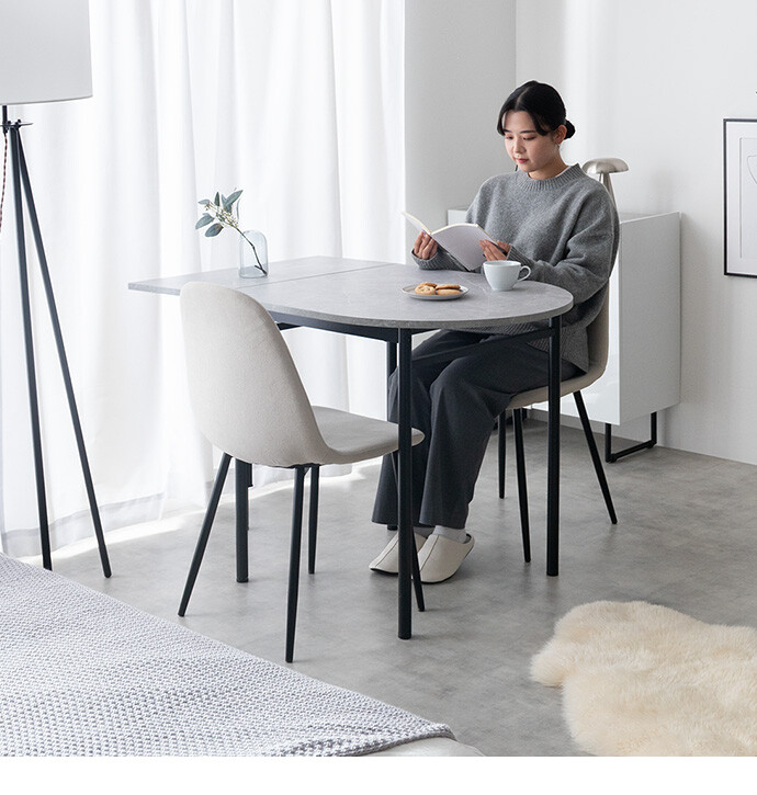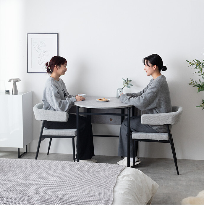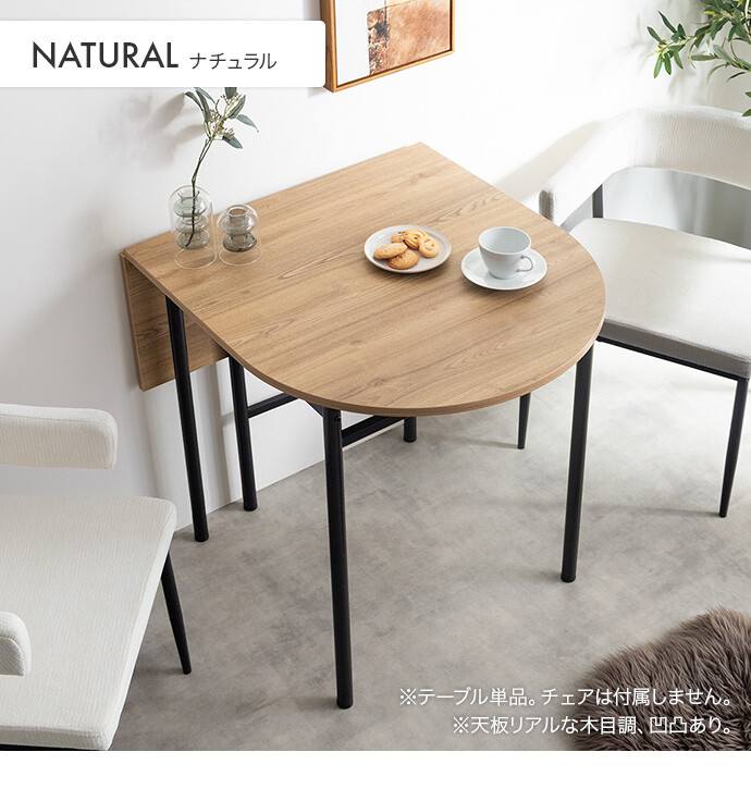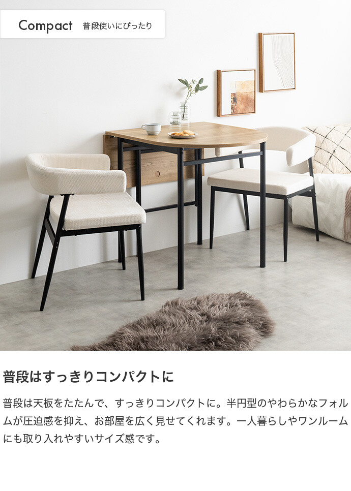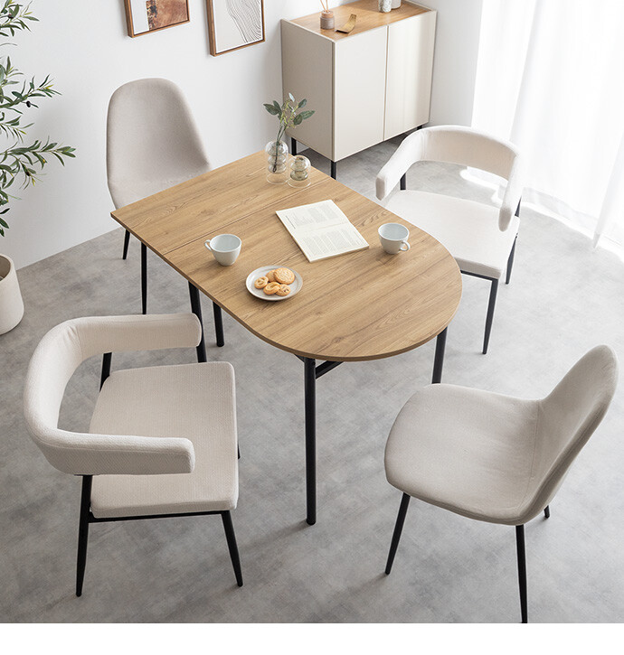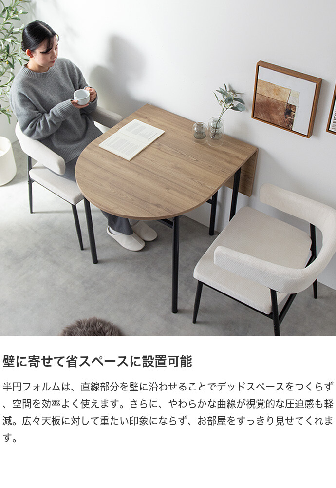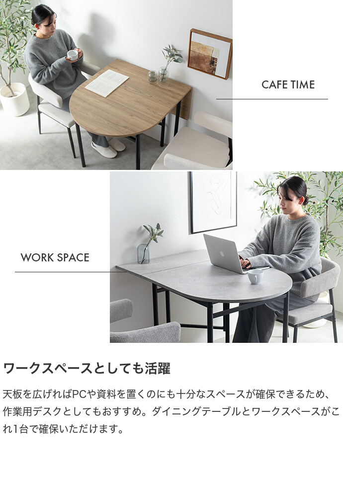 半円を組み合わせたやわらかなフォルムが、空間に抜け感と上質さをプラスする伸縮式ダイニングテーブル。天板を広げるだけで、幅78cmから幅110cmへとサイズ変更が可能です。お部屋を広く使いたい時はコンパクトに、来客時などはワイドに使え、様々なシーンに合わせて活躍します。