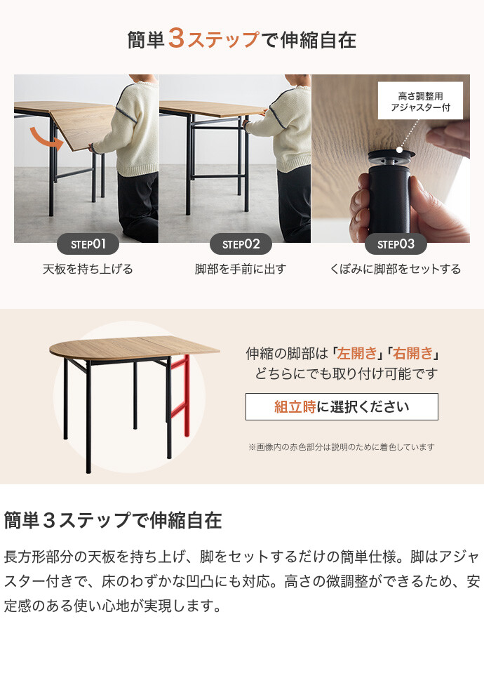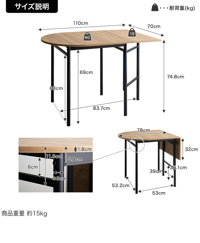 【耐荷重】天板:40kg、伸長部分:約15kg