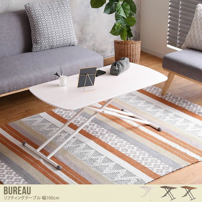 ネジで高さ調節ができる便利なアイテム!『Bureau』リフティングテーブル(幅100cm×奥行50cm)、高くすればダイニングテーブル、低くすればローテーブルとしてお使いいただけます!30.5cmから64.5cmまで、お好みの高さに調節する事ができます。カラーはホワイトウォッシュ・ライトブラウン・ダークブラウンの3色展開しています。※組み立てが必要な商品となっておりますので、ご家庭にあるプラスドライバーをご用意ください。