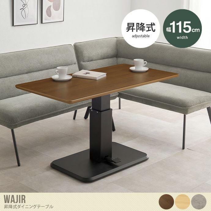 無段階で高さ調節ができる『Wajir(ワジル)』昇降式ダイニングテーブル。ペダル圧式を採用し、足元のペダルを踏みながら天板を上げ下げするだけで、無段階でお好きな高さに調整可能。ダイニングではもちろんリビングなどシーンに応じてお使いいただけます。また天板は幅115cm×奥行60cmと広々設計に。天板の角は丸く処理しているため、小さなお子様がいるご家庭でも安心してお使いいただけます。