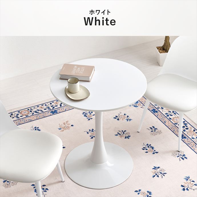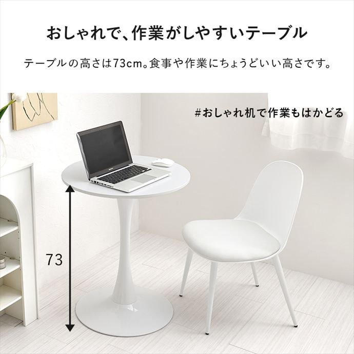置くだけでお部屋に洗練された印象を与えるカフェテーブル。シンプルな天板に、滑らかな曲線が美しい1本脚を組み合わせたデザインは、360度どこから見てもすっきりとした印象で、座る位置を選ばず使えるのが魅力です。また高さは73cmと、食事やパソコン作業、読書など日常使いにちょうどいい高さに設計。コンパクトなサイズ感で、ワンルームや省スペースのお部屋にも取り入れやすく、気軽にカフェのような雰囲気をお楽しみいただけます。