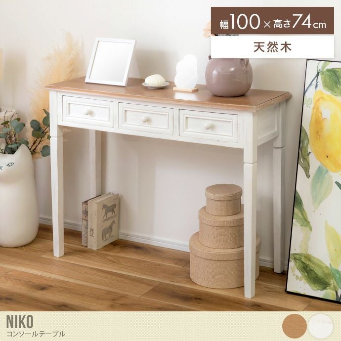 天然木の温もりが心地よい、クラシカルな美しさを纏ったコンソールテーブル。奥行は33cmとスリム設計で、リビングや玄関、寝室など様々な場所に置いていただきやすい設計です。また3つの引き出しを備えており、日々の小物をすっきりと収納可能。北欧スタイルからアンティーク調まで、どんなインテリアにも調和する佇まいが、お部屋に上質な雰囲気をもたらします。