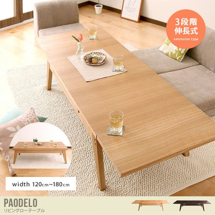 天板を3段階で伸長できる『Paodelo(パオデロ)』のリビングローテーブル。最小120cm~最大180cmまで伸長可能で、普段はコンパクトに、天板スペースが広く必要なときはワイドに広げてと、使い方は自由自在です。また、引いて押すだけの楽々伸長も嬉しいポイント。さらに、天板には温かみのある天然木アッシュ突板を使用しており、使い込むほどに木肌が馴染んでいきます。素材の風合いをいつまでも楽しんでいただけ、末永くご使用いただけるテーブルです。