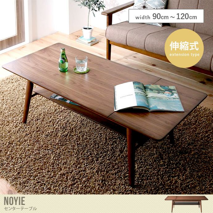 天然木ウォールナットを使用した木の温もりを感じる優しい雰囲気の『Noyie(ノイエ)』のセンターテーブル。繊細な木目が美しく、使い込むほどに味が出るなめらかな木肌が魅力の素材感です。テーブルの片側を折りたたむことができ、2つのサイズに展開。スペースに余裕がないお部屋や急な来客にも適しており、サイドテーブルとしてもご利用いただけます。