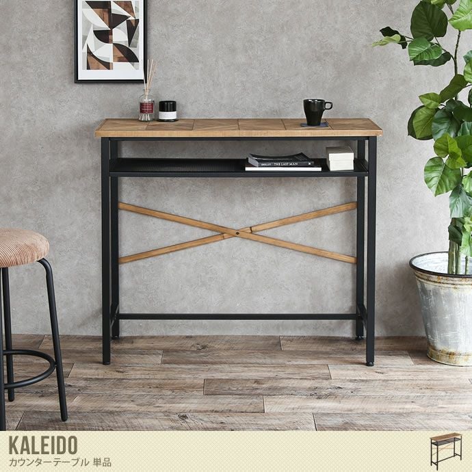 幾何学模様のデザインが魅力の『Kaleido(カレイド)』シリーズからカウンターテーブルが登場しました。天板にはラッカー塗装された古材風パイン材、フレームにはマットな塗装が施されたブラックスチールを使用し、異素材の組み合わせが魅力のヴィンテージ調の仕上がりです。奥行き38cmのスリムなフォルムで、窓辺の明るい場所に置いて作業や読書をするのに最適。またコンパクトサイズなので、ワンルームにお住まいでワークテーブルが欲しい方にオススメです!