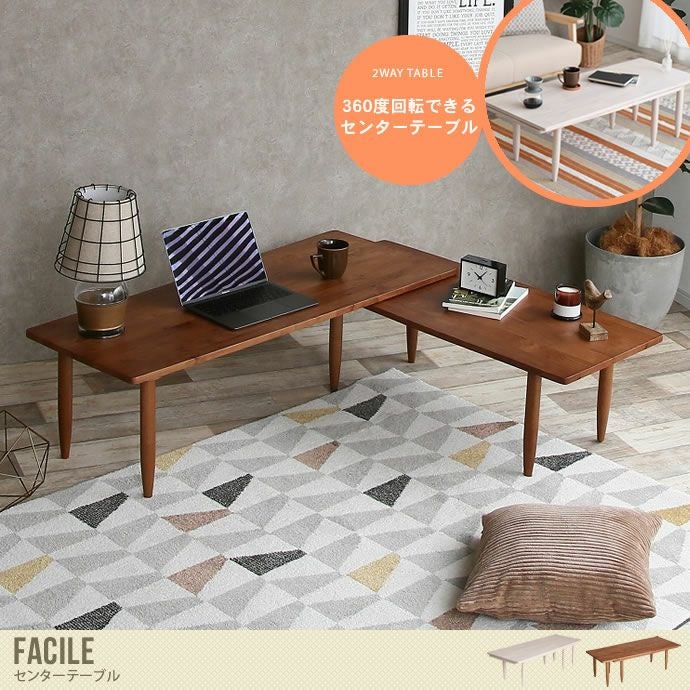 北欧、ナチュラルテイストにぴったりな『Facile』センターテーブル。360度自由に天板が動くデザインで、あらゆるシーンで活躍します。友人が遊びに来たときや作業テーブルなど使い方はさまざま! 天板は最長約200cmになりますので、たくさんの食器を並べても窮屈感なくお使いいただけますよ。また、リモートワークにも最適でL字型にすることで、ノートPCと書類を両方広げて作業することができます。北欧テイストの明るい空間を演出するホワイトウォッシュと落ち着いた大人空間を演出するブラウンの2色展開です。