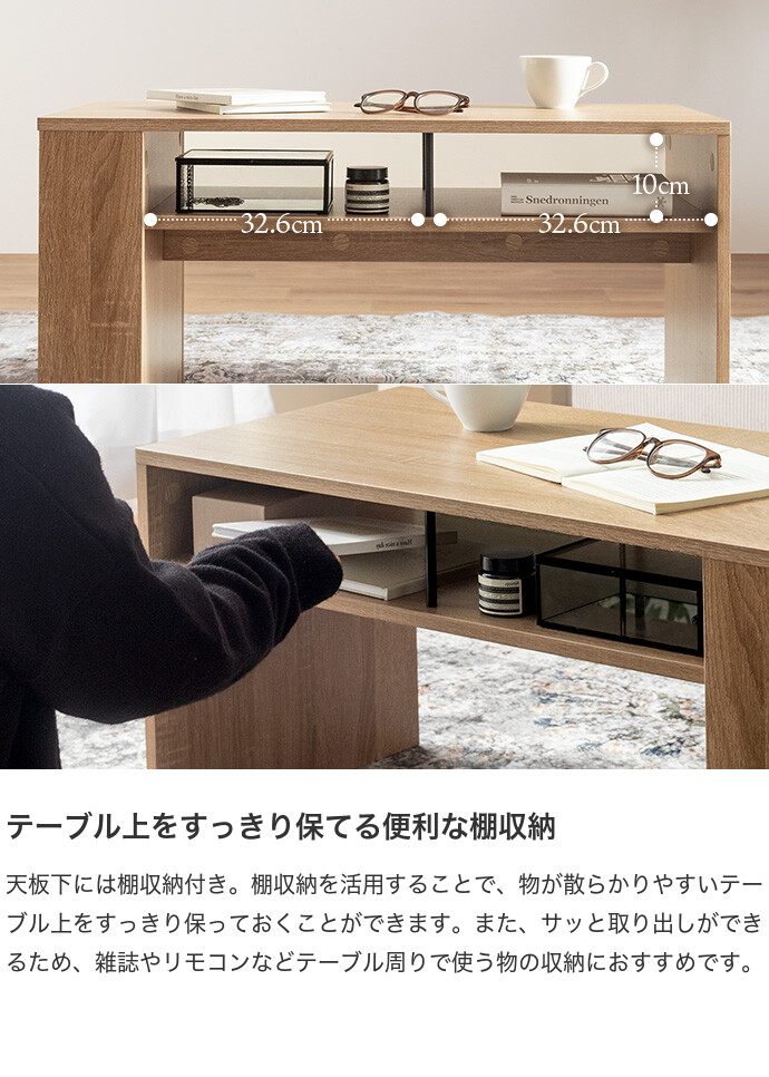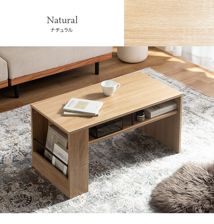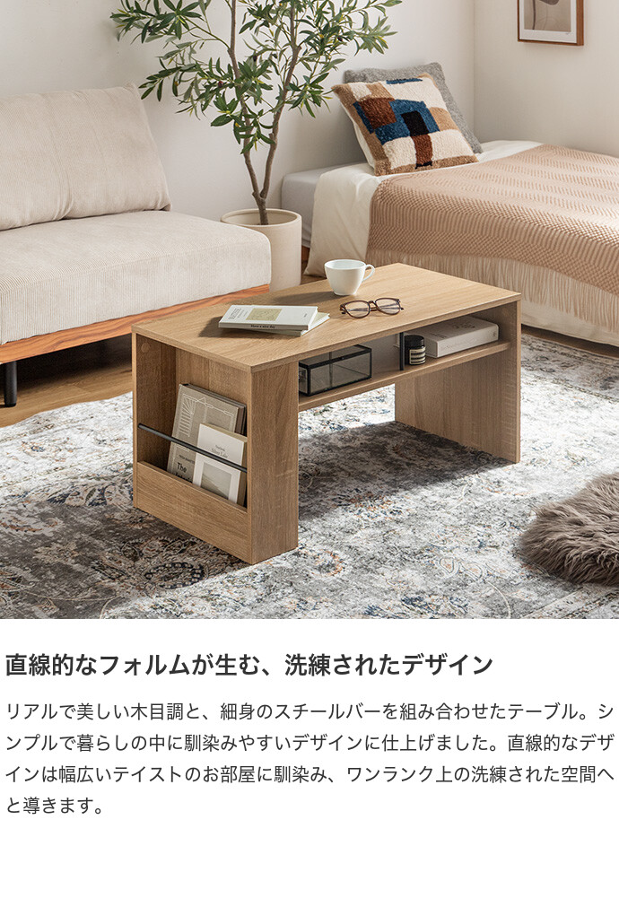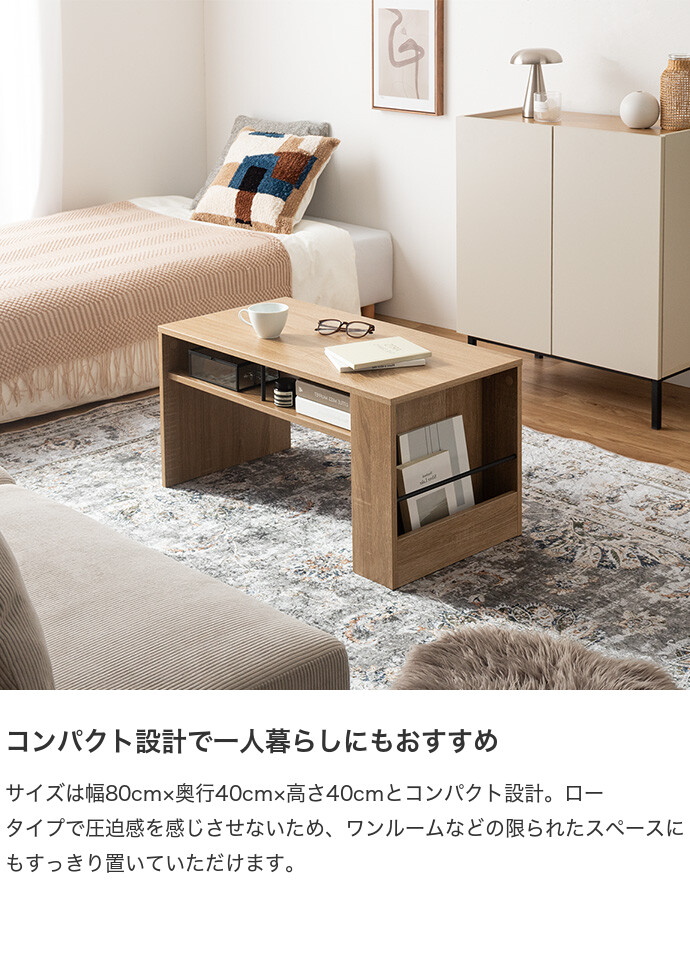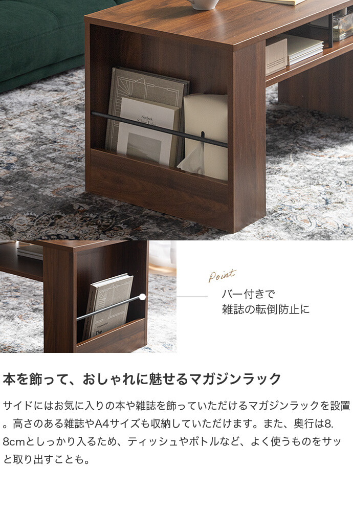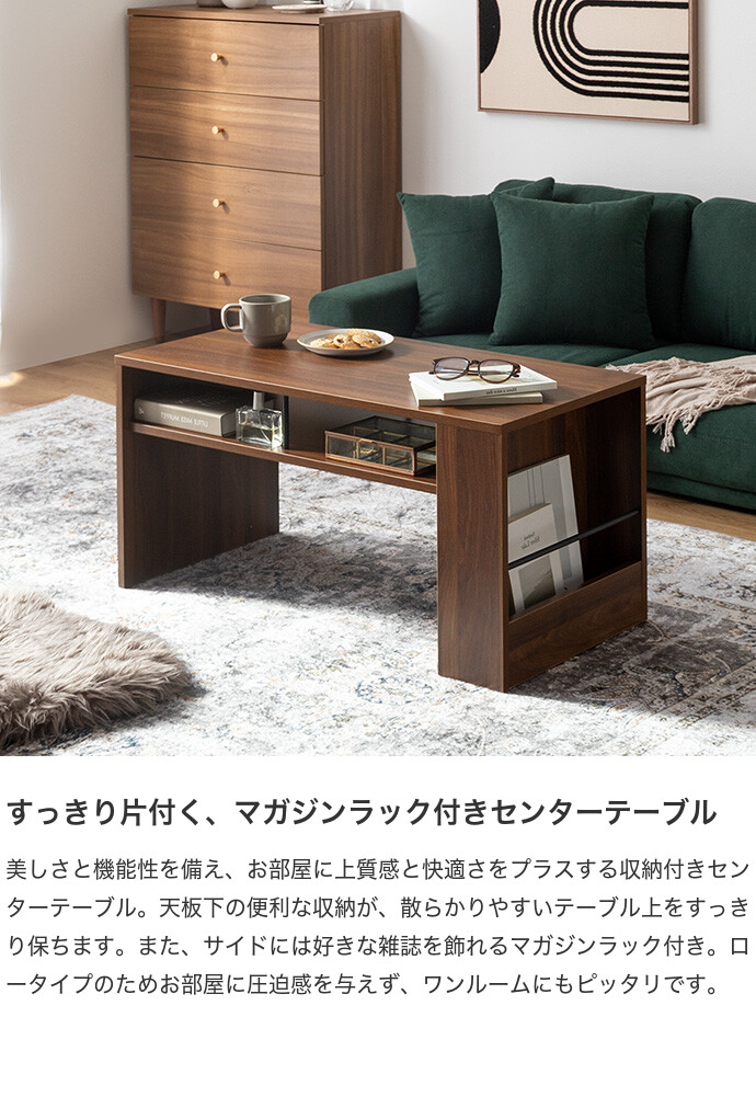 美しさと機能性を備え、お部屋に上質感と快適さをプラスする収納付きセンターテーブル。天板下の便利な収納が、散らかりやすいテーブル上をすっきり保ちます。また、サイドには好きな雑誌を飾れるマガジンラック付き。ロータイプのためお部屋に圧迫感を与えず、ワンルームにもピッタリです。