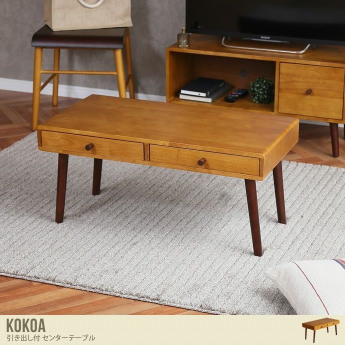 明るめのブラウンカラーが目をひく『Kokoa』引き出し付センターテーブル。木のぬくもり感じる、あたたかみのあるつくりです。男女共に使えるデザインですので、カジュアルから大人カッコイイテイストまで幅広くマッチしますよ。素材は木目が美しいラバーウッド材を使用。高級感のある仕上がりでワンランクアップした空間を演出します。