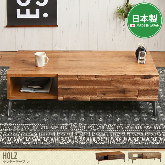 テーブル周りをスッキリ快適にしてくれる収納付きセンターテーブル『Holz(ホルツ)』。引き出し収納とオープン収納が付いており、散らかりがちな小物類を片付けてくれます。細々としたリモコン類や眼鏡などは引き出しへ、CDやティッシュはオープン収納へ収めて頂けます。また、機能性だけでなくデザインにもこだわった丁寧なつくりをしています。木目模様の美しいプリント仕上げの本体に、引き出しの前板にアカシア無垢材を組み合わせ、シンプルで男前なスチール脚をつけた存在感のあるデザインをしています。見栄えと機能を両立した収納付きテーブルだから居心地のいい洗練された空間づくりを楽しんで頂けます。