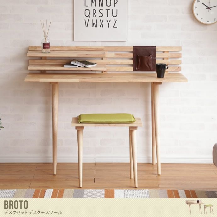 『Broto』デスクセットは、見た目の美しさだけでなく機能も充実したデスクとコンパクトサイズのスツールのセットとなっております。デスクの天板は幅120cmと広々としたスペース。2枚の棚板とポケットが付いており取り外しも簡単。とても便利です。ホール部分はカップホルダーや容器を置いてペンホルダーとしてもお使いいただけます。スツールはデスク下にしまえるので邪魔になりません。北欧風やナチュラルテイストのお部屋だけでなく、どんなテイストのインテリアにも馴染みやすいデスクセットです。