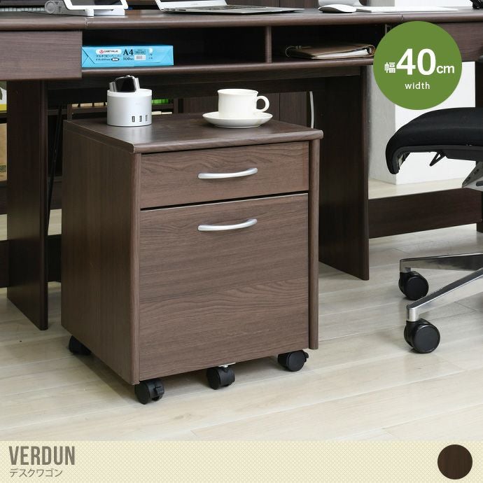 高級感のある色調の木目が特徴的な『Verdun(ヴェルダン)』シリーズのデスクワゴン。上段にはノートや筆記用具など、デスク周りで散らかりがちな小物を収納できます。下段はA4ファイルも入る大きさなので、デスクの横に置くだけでたっぷり収納が可能。シリーズのデスクと合わせて頂くことでより統一感のあるインテリアが実現できます。