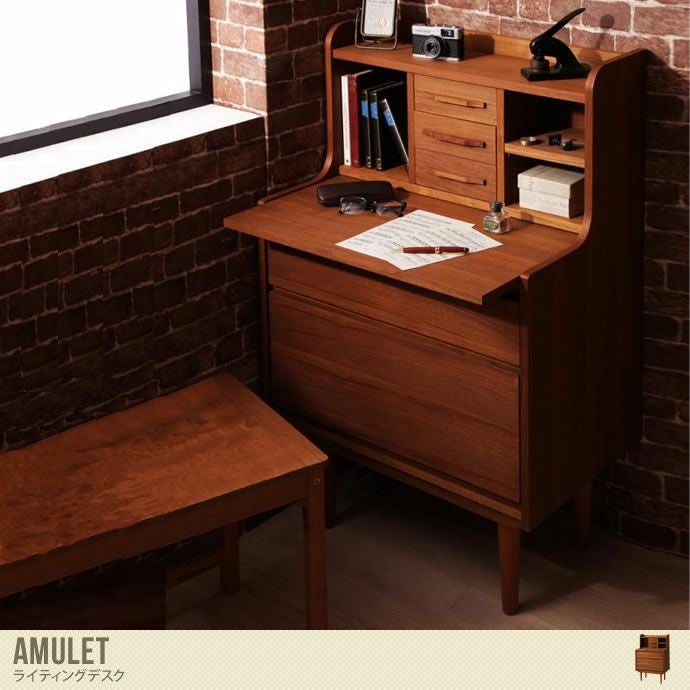 『Amulet』ライティングデスクは、美しい木目とアンティークデザインが上品で落ち着きと高級感のあるライティングデスクです。天然木チーク材が贅沢に使用されており、木の温もりがあふれる空間になります。机上に小さめの引き出し3杯と下段に2つのサイズ違いの引き出しがあるので収納力バツグン!机の天板は可動式なので、使用時は手前にスライドさせることで作業スペースとしてお使いいただけます。書斎にはもちろん、お子様の勉強机としてもお使いいただけますよ♪