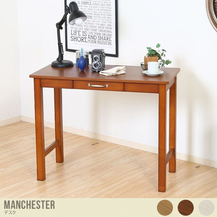 キレイな木目の引き出し付きのデスク『Manchester(マンチェスター)』。木目でシンプルなデザインなので、どんなお部屋のインテリアにも合わせやすいです。