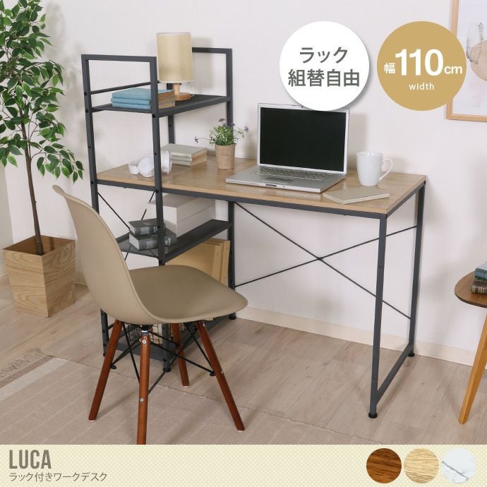 リビングでも使えるワークデスク『Luca(ルカ)』シリーズからラック付きのデスクが登場しました。3段でできたラックは左右どちらでも組み替えることができる優れもの。お部屋の間取りや他のインテリアに合わせて設置していたいただくことができます。カラーは様々なテイストに合わせやすい3色をご用意。木目調のデザインから大理石柄まで、お部屋のテイストにあったお好きなデザインをお選びいただけます。