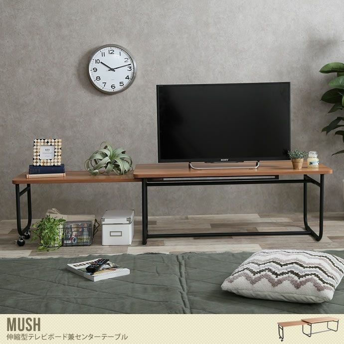 落ち着いた色合いの木目調とシックなブラックスチールの異素材感が目を惹く“Mush(マッシュ)”伸縮型テレビボード兼センターテーブル。全体的に丸みを帯びており、柔らかさと温もりを感じられるフォルムになっています。伸縮型なので、横幅を105cm~169cmの間で自由に調節することができます。また、テレビボードとして使うだけでなく、お部屋の中央に置いてセンターテーブルとしてもお使いいただけるので、使い勝手バツグンです!どんなお部屋にも合わせやすいので、ワンルームや広めのリビングでも場所を気にせずお使いいただけます。